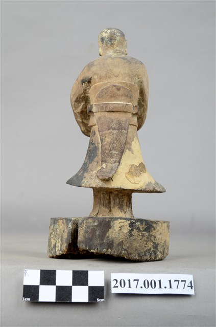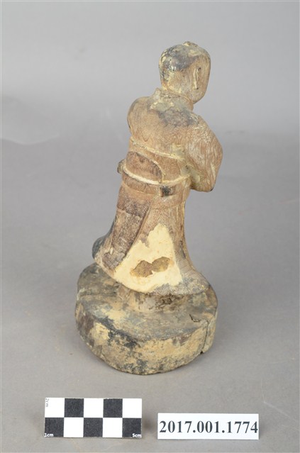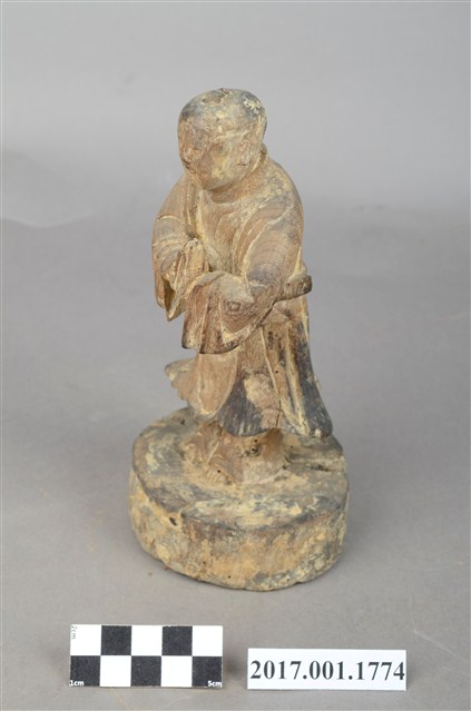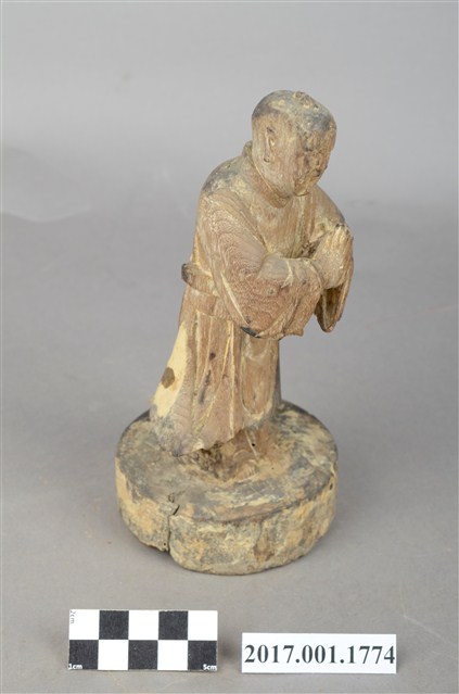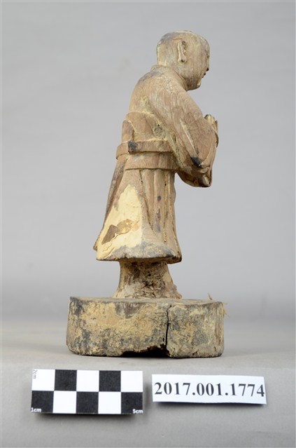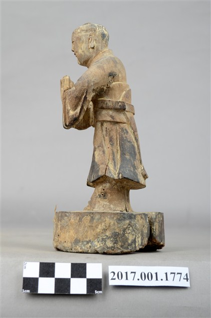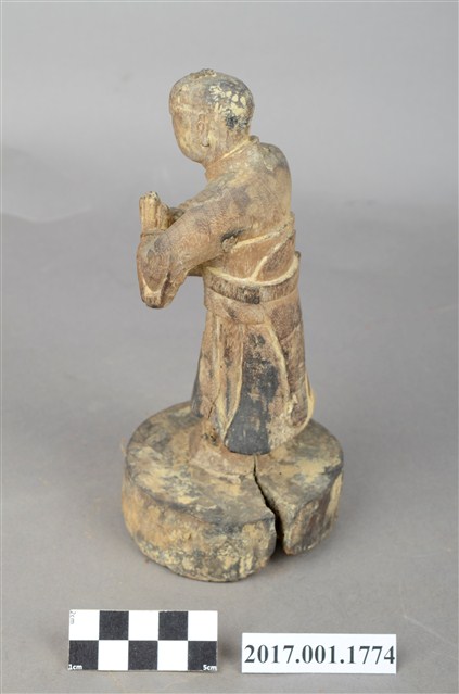 1.本件木雕善財童子像作立姿,粧佛已除去,臺座右後方一道皸裂紋,底部佈有蛀蝕孔。善財童子臉部下頷修長,口部微張,頭部微側向左方,作仰視貌,頭頂梳單片垂髫,身著窄袖及膝圓領袍服,雙手合十於左胸前,腰間繫有腰帶。雙足並立,跣足,站立於圓形臺座上。