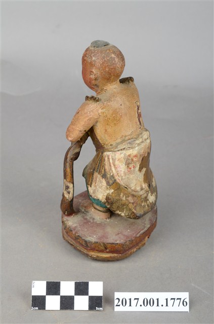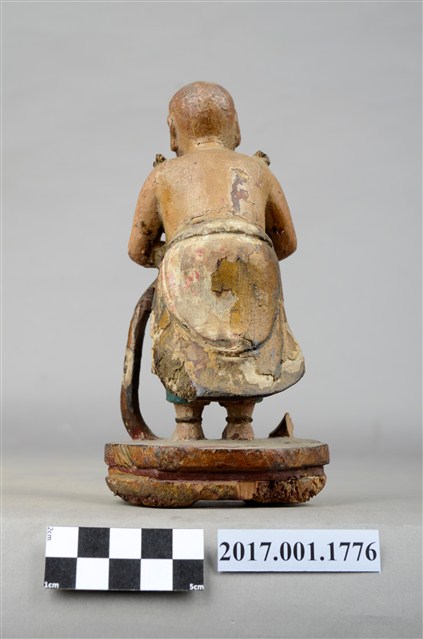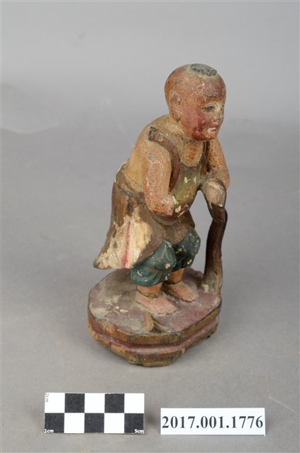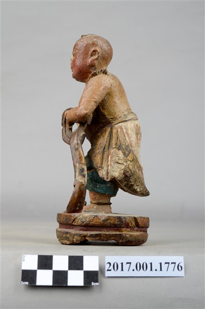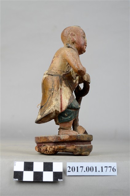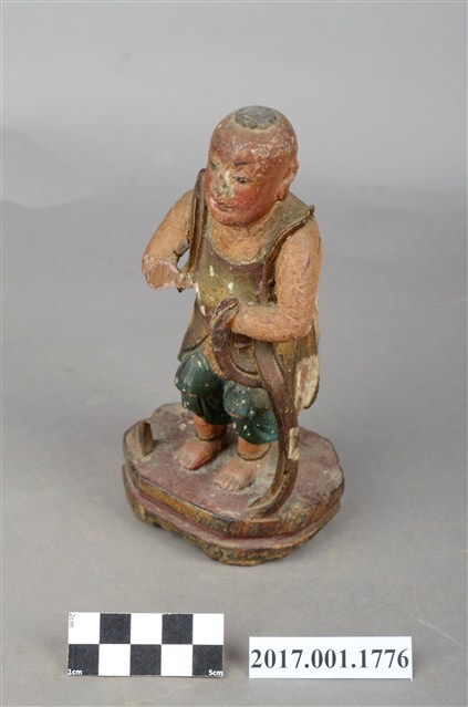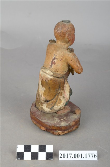 1.本件木雕善財童子像作立姿,雙手自腕部削除缺損,身右之飄帶斷裂缺損。善財童子作孩童臉,頭部微側,作仰視貌,頭頂梳單片垂髫,上身赤裸著肚兜,肩上披一條飄帶,自肩部垂至臺座,下身內著過膝短褲外罩短裙。雙足並立帶有腳環,跣足,臺座作八邊形束腰矮臺。