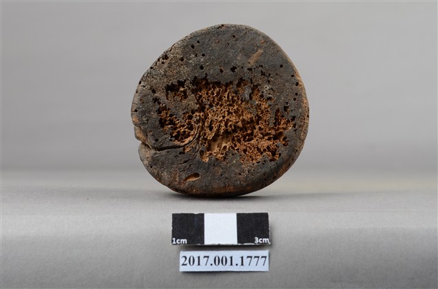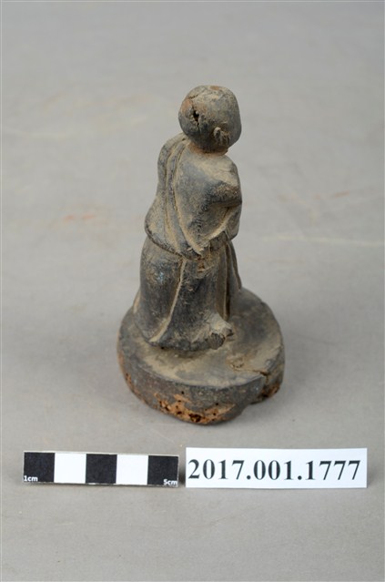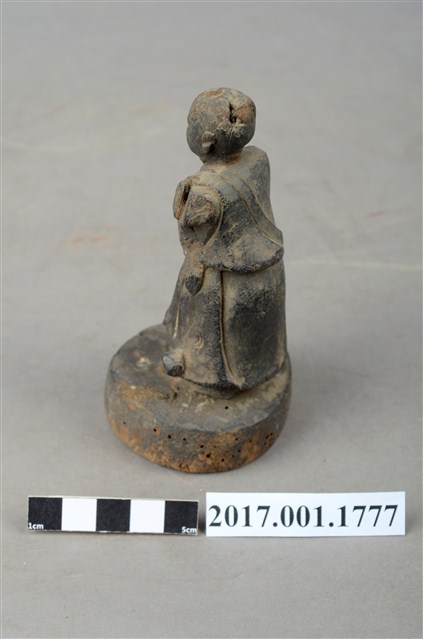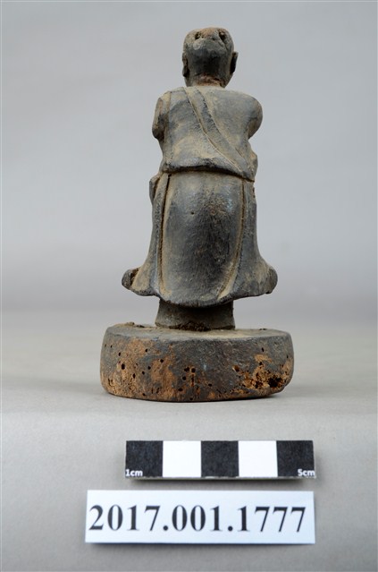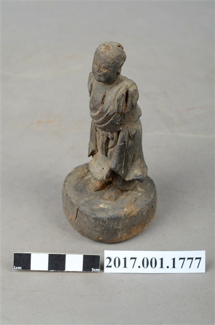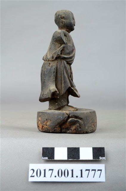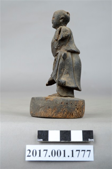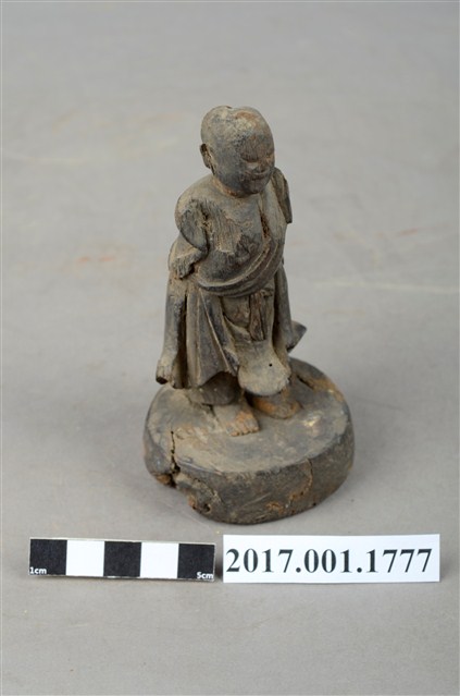 1.本件木雕善財童子像作立姿,表面已褪去並佈滿污漬,臉部磨損,雙手自肩部以下缺損,頭頂後方及臺座有蛀蝕孔。善財童子作孩童臉,頭部微側向左方,作仰視貌,身著斜襟過膝袍服、長褲,偏袒右肩及右胸,腰間繫有腰帶。雙足並立,跣足,站立於圓臺上。