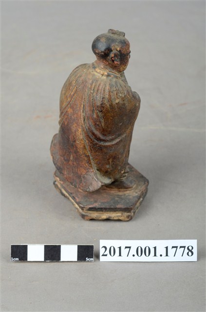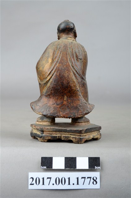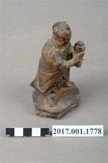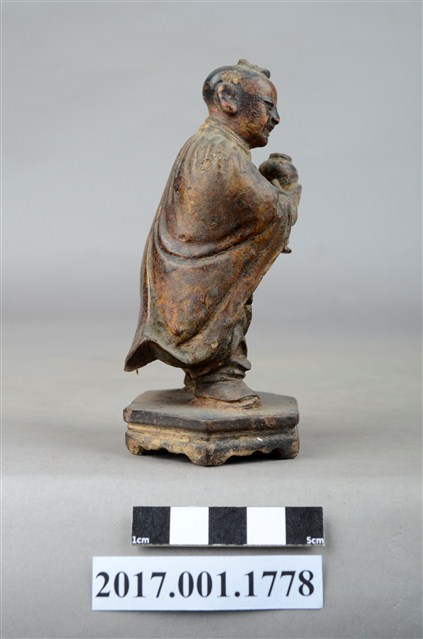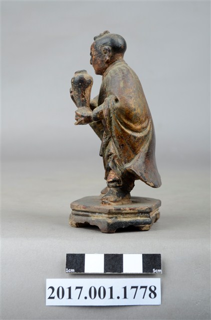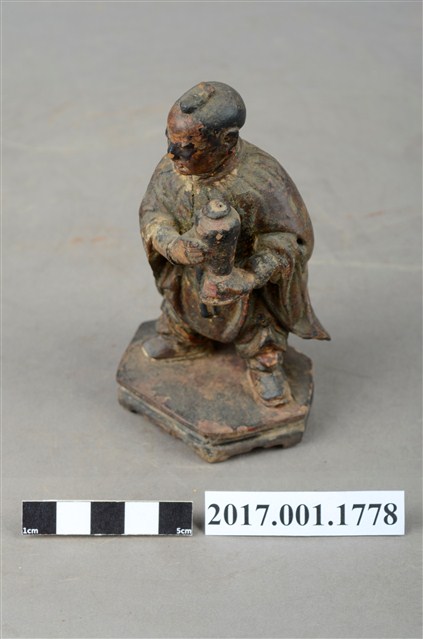 1.本件木雕善財童子像作立姿,表面褪色並佈滿污漬,嘴部缺損。善財童子作孩童臉,頭部微偏向右方,作仰視貌,頭頂梳單片垂髫,身軀略向前躬,著窄袖過膝袍服、長褲,披風衣,腰間繫有腰帶,左手向內平舉,右手向內上舉,托持一只花瓶。雙足打開腳尖朝外,站立於六邊形束腰矮臺上。