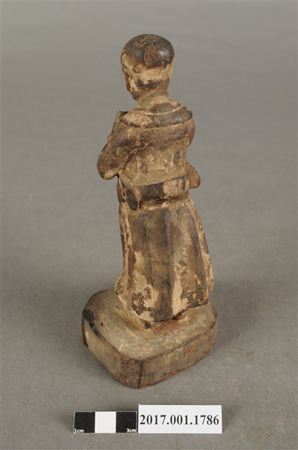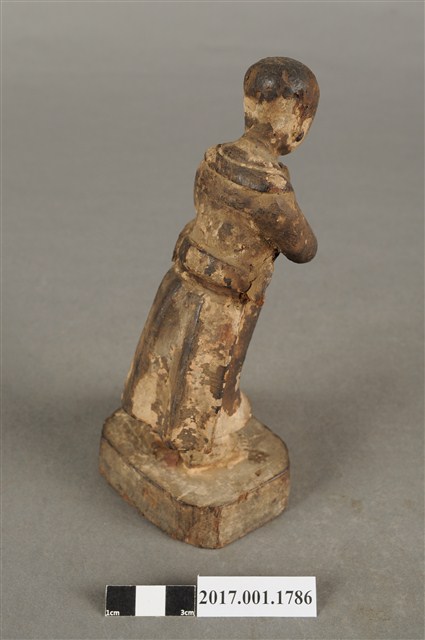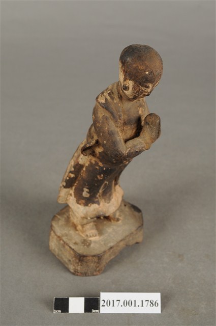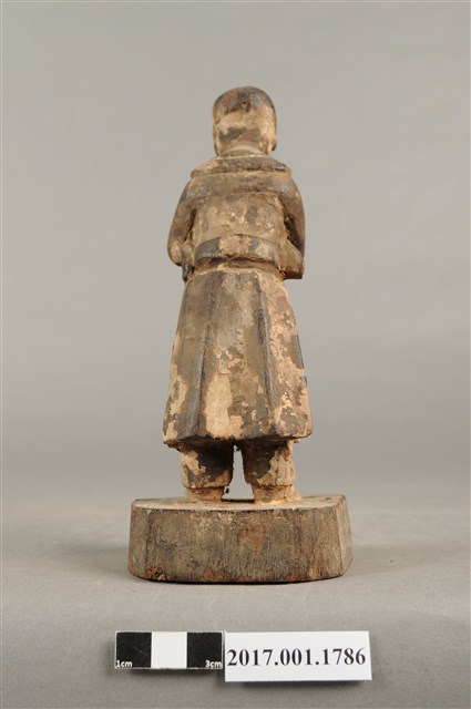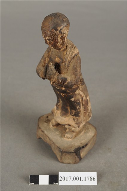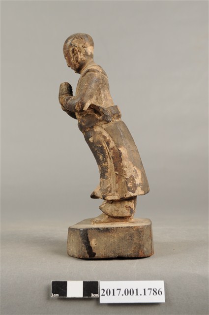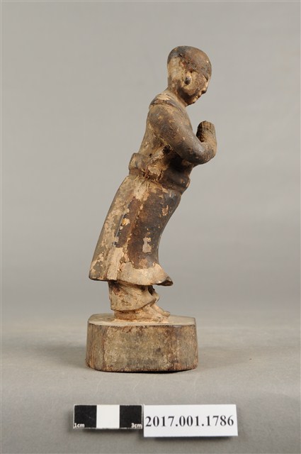 1.本件木雕善財童子像,作站姿姿態,表面施作塗裝粧佛技法,漆面剝落嚴重。善財童子作孩童臉,頭部微側向右方,雙目半睜,緊抿著嘴,上半身赤裸披著巾,下半身著長褲,外圍裙,腰繫布帶,雙手佩戴手釧。跣足,立像挺身站於臺座上,雙手合十置於左胸前。