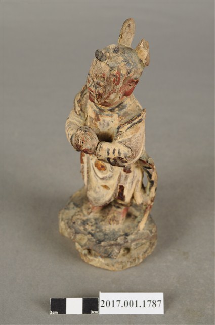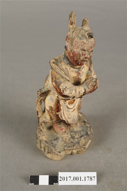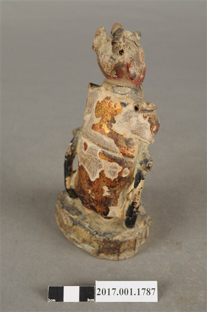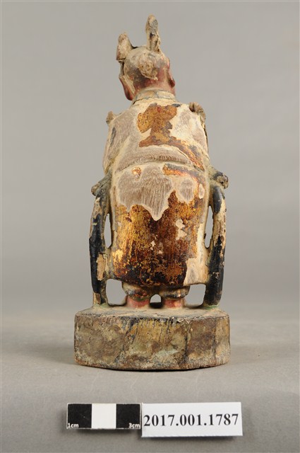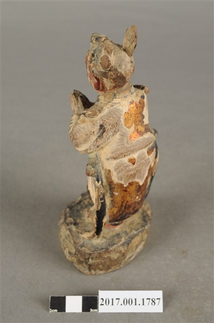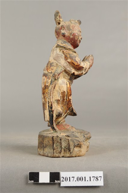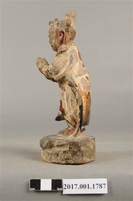 1.本件木雕善財童子像,作站姿姿態,表面施作塗裝、安金不見紅粧佛技法,粧佛剝落嚴重。善財童子作孩童臉,頭部微側向右方,作仰視貌,緊抿著嘴,髮梳ㄚ髻,上半身著窄袖大袍遍身,下半身著長褲,腰繫布帶,披一條飄帶。跣足,立像挺身站於岩座上,雙手合十置於胸前。
