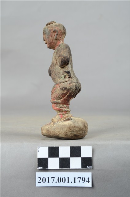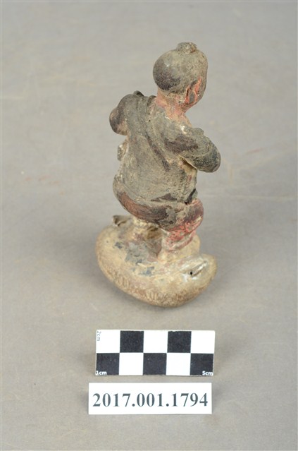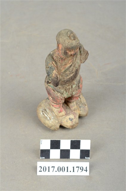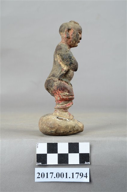 1.本件木雕善財童子像,作站姿姿態,表面施作塗裝粧佛技法,漆面剝落嚴重。善財童子作孩童臉,雙目半睜,頭頂梳雙髻,上半身偏袒右肩,下半身著長褲,褲管捲至膝蓋處,腰繫布帶,披一條飄帶,飄帶大部分已斷裂缺失。體態向前半蹲,跣足,站於臺座上,雙手手掌缺失。臺座平面形如「山」字。