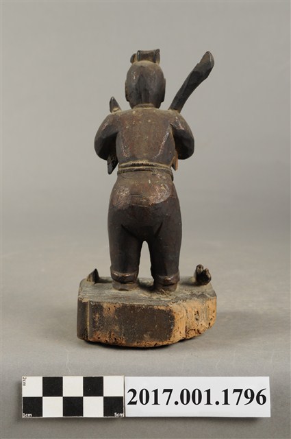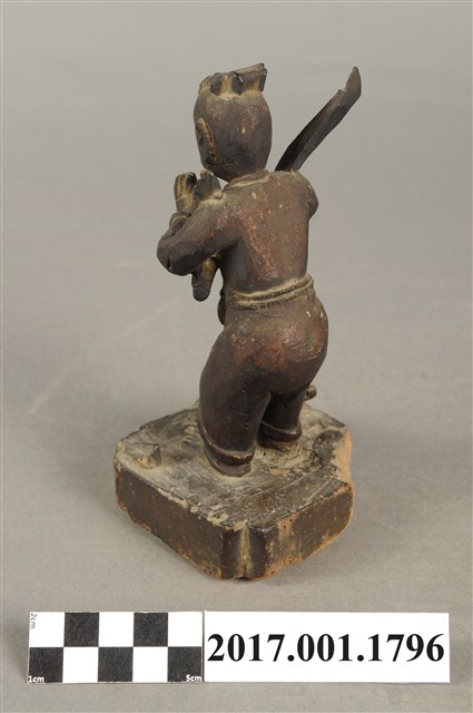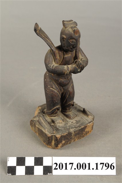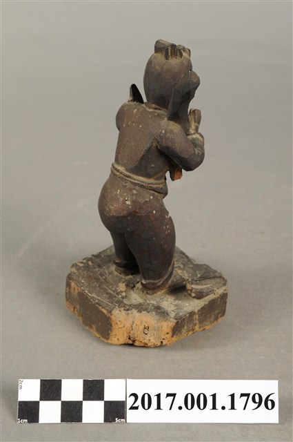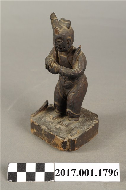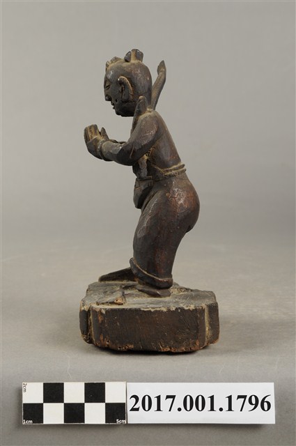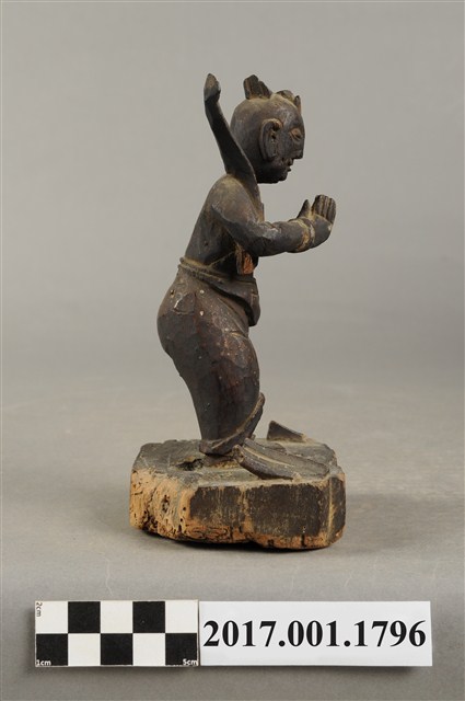 1.本件木雕善財童子像,作站姿姿態,表面施作塗裝粧佛技法。善財童子作孩童臉,雙目半睜,有酒窩,髮梳ㄚ髻,上半身著肚兜,下半身著長褲,腰繫布帶,披一條飄帶,四肢佩戴手釧。身軀向前傾,跣足,雙足並立於臺座上,雙手合十置於胸前。