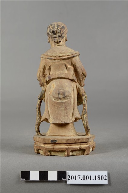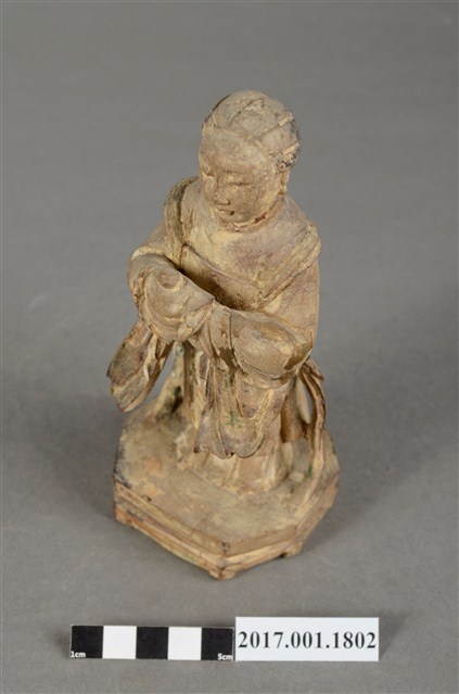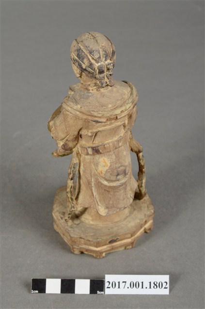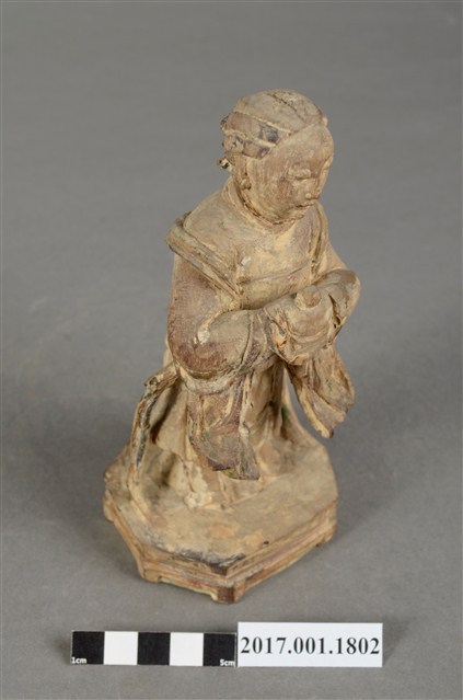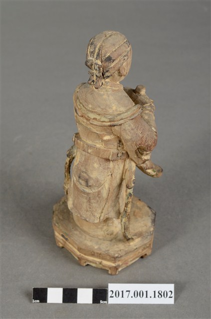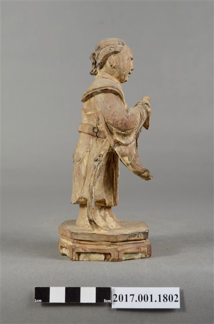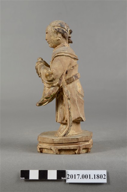 1.本件木雕龍女,應與善財兩位成組配對,為觀世音菩薩的左右脅侍,民間常俗稱「金童玉女」。龍女採合掌捧珠的立姿姿態,以木雕製作方式,有彩繪,表面已脫落。龍女站在一八角形臺座上,底部平整,原先成組的觀世音菩薩和善財則未知下落。龍女髮往後梳,在後綁起雙垂髻,身穿軟服長裙,身披飄帶,垂於腰側之下。龍女雙手合掌,合托一寶珠。