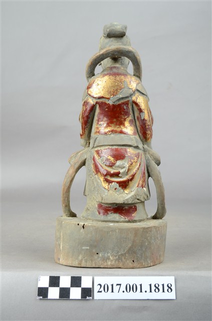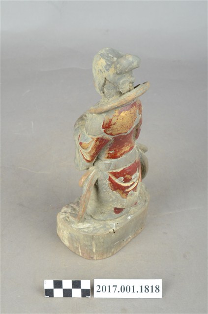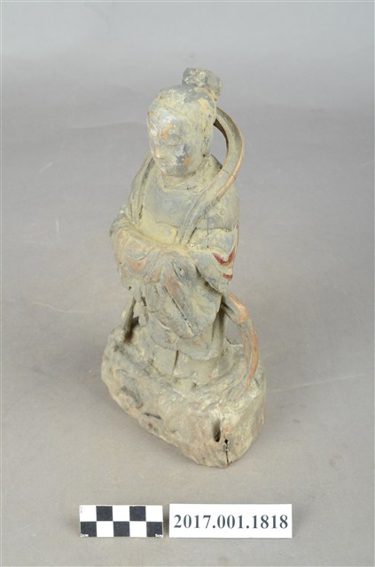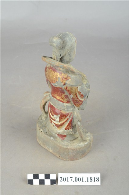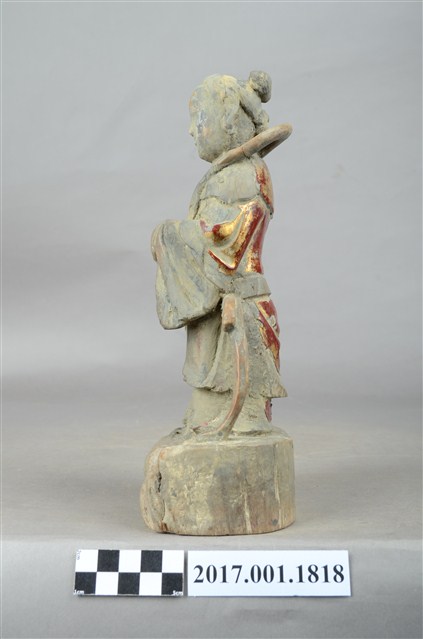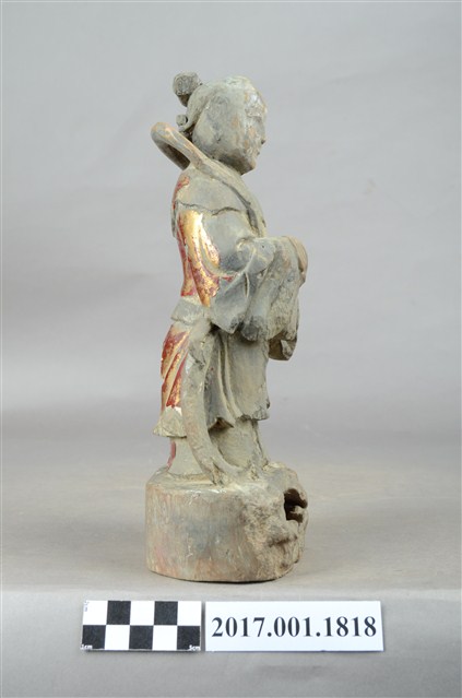 1.本件木雕龍女像,表面施作塗裝、安金不見紅粧佛技法,安金剝落嚴重。顏面表現雙目半睜,頭頂梳髮髻,身著寬袖衣、下身著裳,裳前有蔽膝,披一條飄帶,飄帶垂至岩座。立像挺身以雙足並立的姿態站於岩座,雙手高舉於胸前托珠。