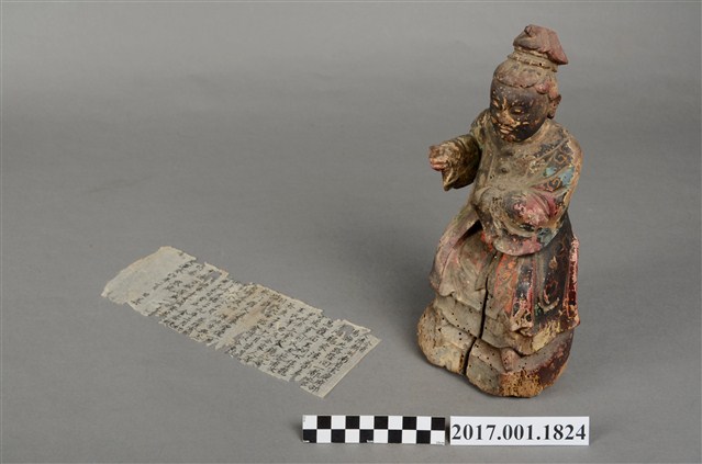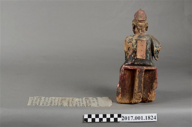 1.本組木雕蔡門羅氏婆婆像與命書,蔡門羅氏婆婆像在背面開有長方形入神洞,封榫佚失,入神物有命書、絲線等物,外表剝落,臉型輪廓橢圓,雙眼半睜。頭戴軟巾,身著寬袖長袍,腰繫布帶,長袍外套著對襟罩衫,腳穿弓鞋,坐於臺座上。挺身端坐,雙足垂下,左手橫伸向右,左手掌已削除,右手彎肘虛握於右胸側,手指部分缺損。