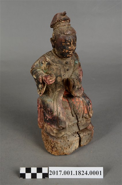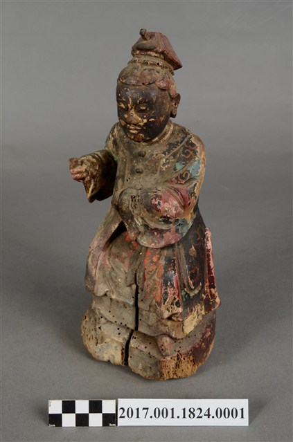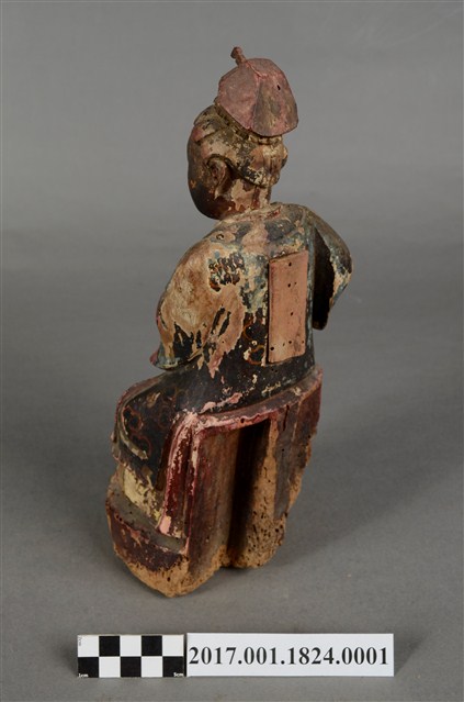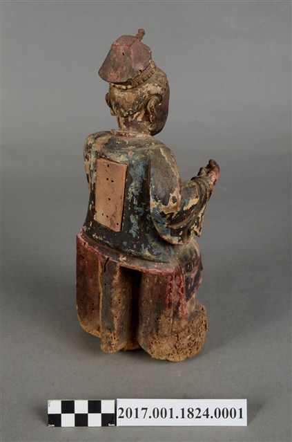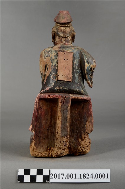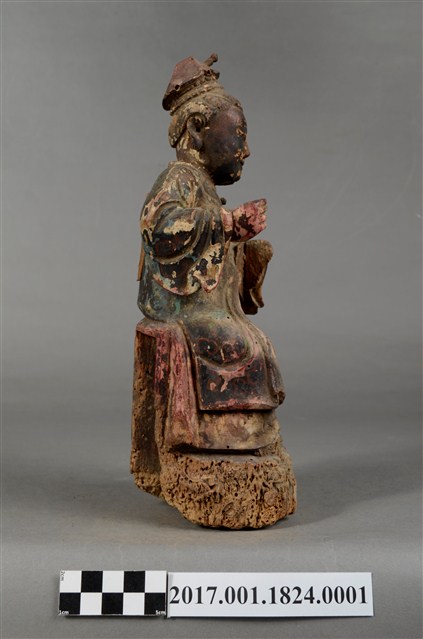 1.本件木雕蔡門羅氏婆婆像,作坐姿姿態,坐於臺座上,外表粧佛剝落,背面開有長方形入神洞,封榫佚失,入神物有命書、絲線等物。臉型輪廓橢圓,雙眼半睜。頭帶軟巾,身著寬袖長袍,腰繫布帶,長袍外套著對襟罩衫,腳穿弓鞋。挺身端坐,雙足垂下,左手橫伸向右,左手掌已削除,右手彎肘虛握於右胸側,手指部分缺損。