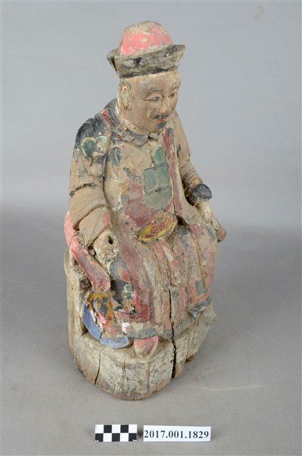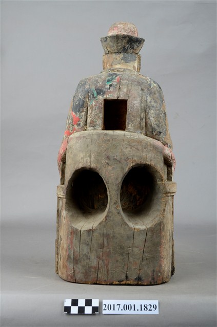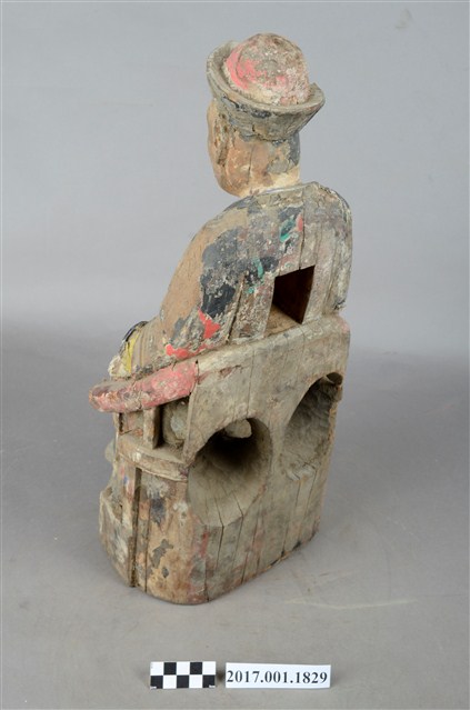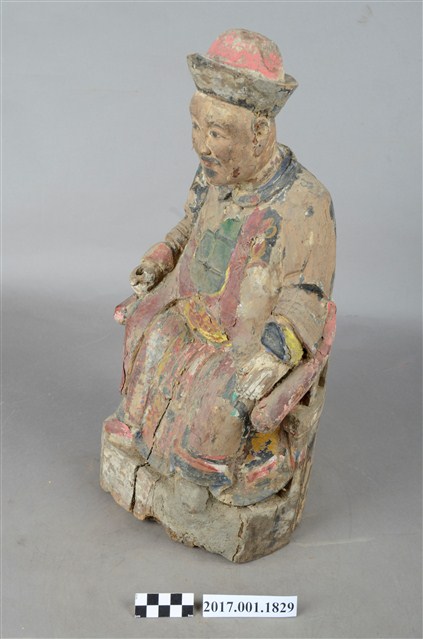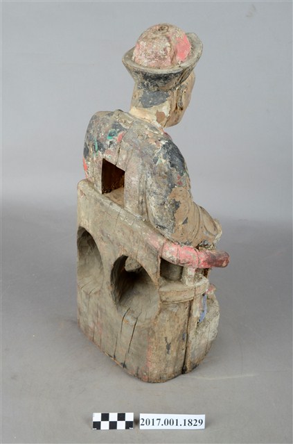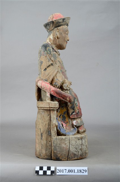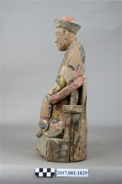 1.本件木雕祖先像,採坐姿姿態,表面施作塗裝,局部漆面剝落,背面開有方形入神洞,封榫尚存。祖先像作壯年男子相貌,顏面彩繪五官、鬍鬚。作清朝官員扮相,身著長袍,腰繫布帶,外套著馬褂。挺身端坐,雙足垂下,雙手置於圈背椅的扶手上,左手放掌、右手握拳。