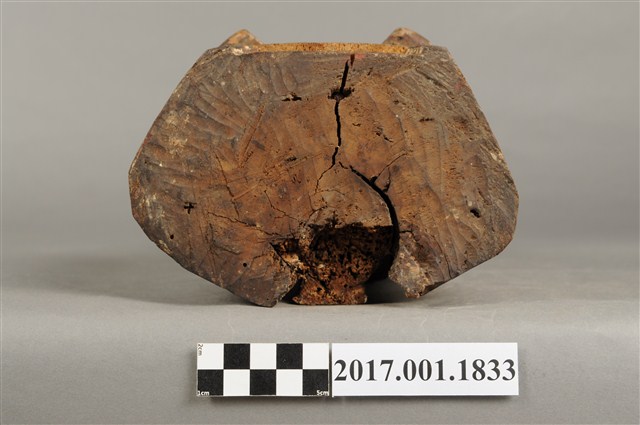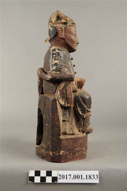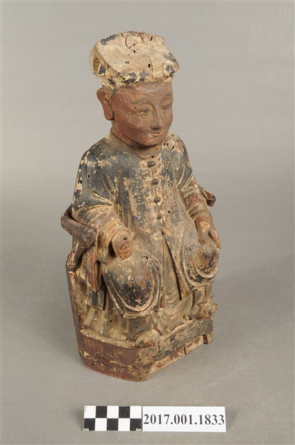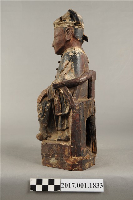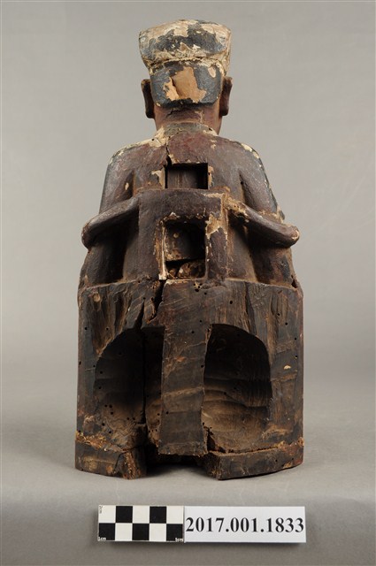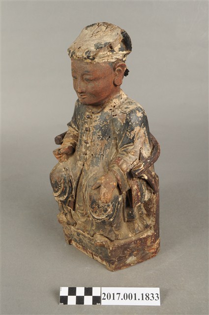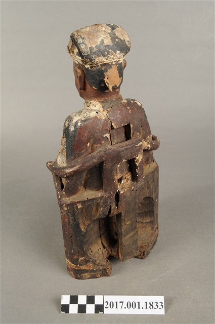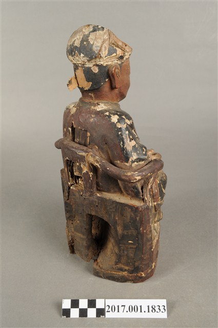 1.本件木雕祖先像,採坐姿姿態,表面施作塗裝粧佛技法,局部漆面剝落,背面開有方形入神洞,封榫尚存。祖先像作壯年男子相貌。頭戴方巾,身著馬褂。挺身端坐,雙足垂下,右手握拳置於腿上,左手掌至於腿上。本件祖先像無辮子,推測為民國時期所塑造的祖先像。