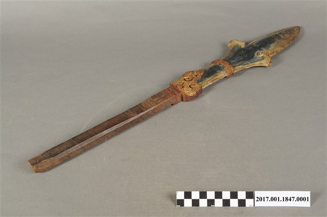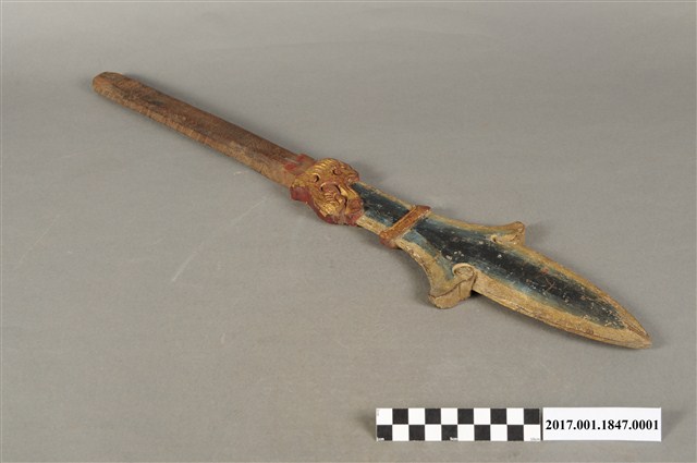 1.本件木雕三尖兩刃刀,表面施作塗裝,局部漆面剝落。刀地平塗藍漆、刀刃平塗白漆,刀地上的金圈施作安金,刀鍔雕刻螭虎吞口,螭虎表面安金。