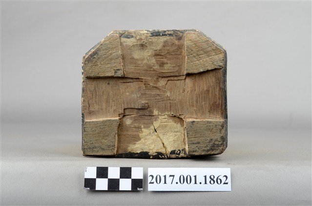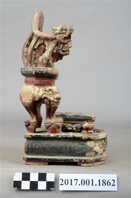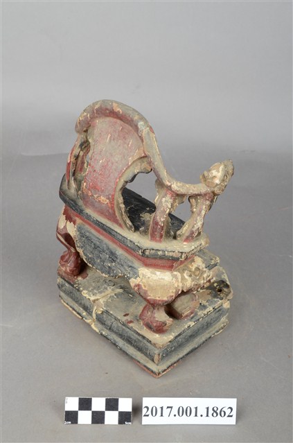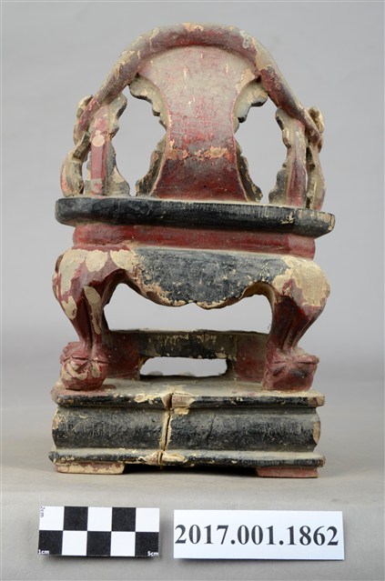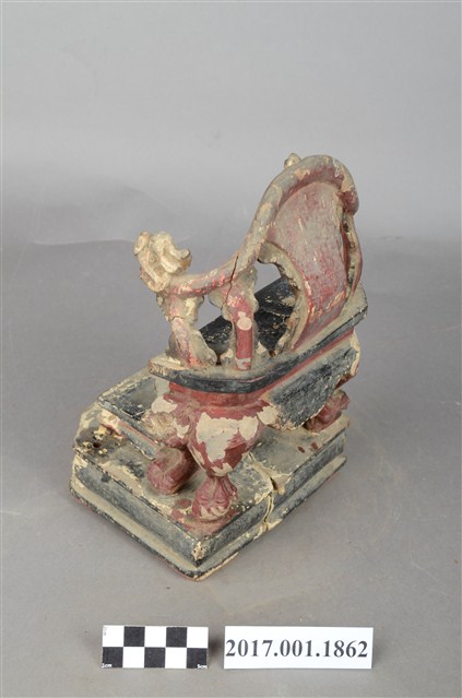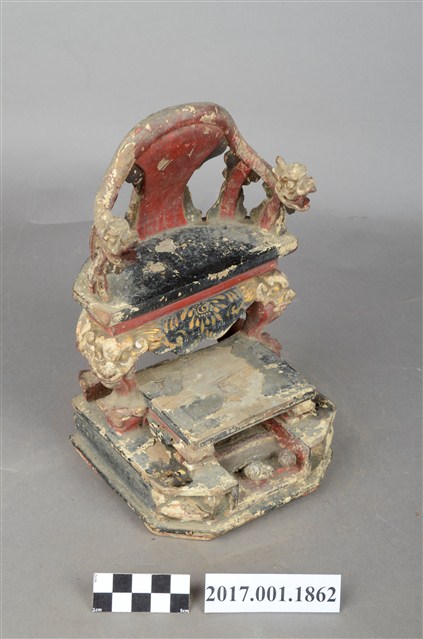 1.本件木雕神像座椅,表面施作塗裝,局部漆面剝落。座椅款式為圈背椅,扶手的出頭雕刻龍頭,左側扶手出頭有裂痕,椅子的前腿雕刻螭虎吞腳,卷口牙子彩繪寶相花紋。椅前有踏几。圈背椅下的臺座在座面兩端有榫洞,應是要插入獅座之用,臺座有凹槽,凹槽內作龜蛇,可知該座椅為玄天上帝所坐。