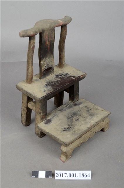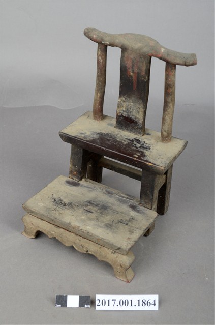 1.本件木雕神像座椅,表面施作塗裝。座椅款式為明式二出頭燈掛椅形式,座椅的前足銜接踏几,鞋接觸有裂痕,裂痕處有明顯修補痕跡。