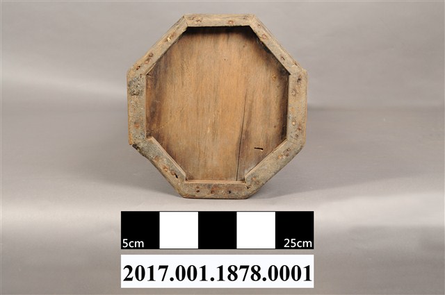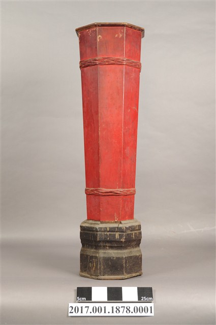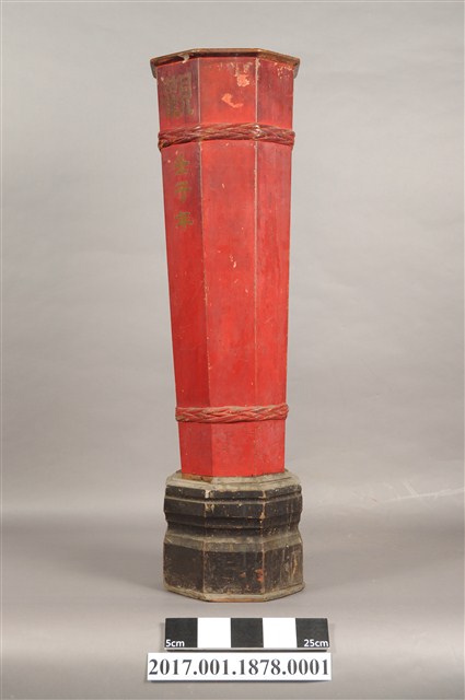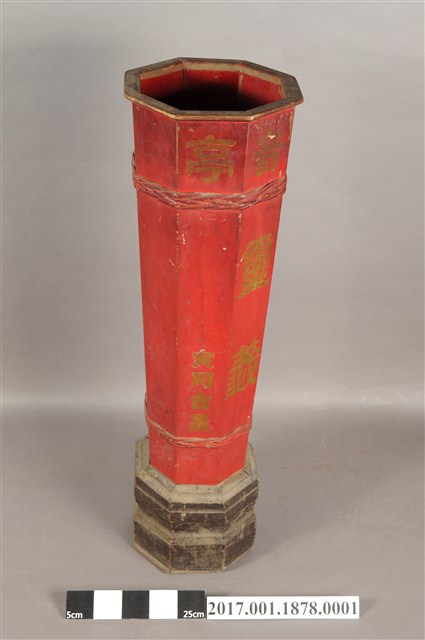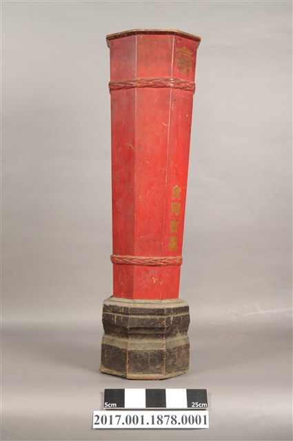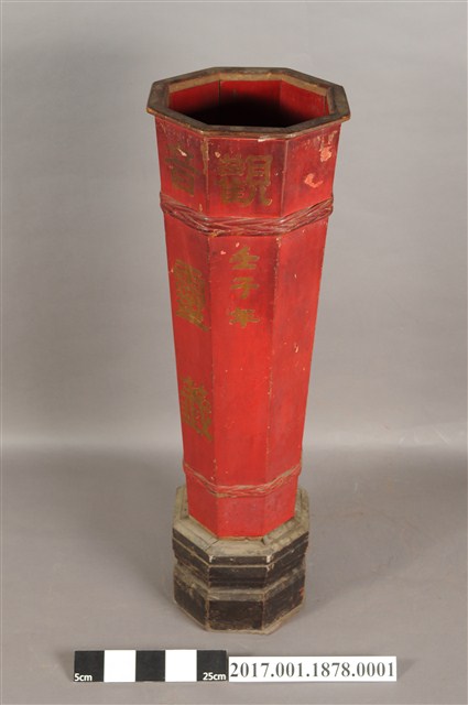 1.本件觀音亭籤筒為木製,平面呈現八角形,分為籤筒與臺座,籤筒固定在臺座上,籤筒的桶面漆紅漆、臺座漆黑漆,臺座局部受損。籤筒由八片上寬下窄的木片以嵌接的方式,在上、下方以竹篾編成的箍圈箍緊,桶面金字橫向書寫「大觀音亭」,縱向書寫「靈籤」、「壬子年」、「寅月吉置」。壬子年為西元1972年。