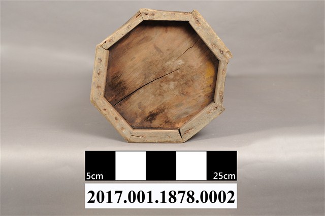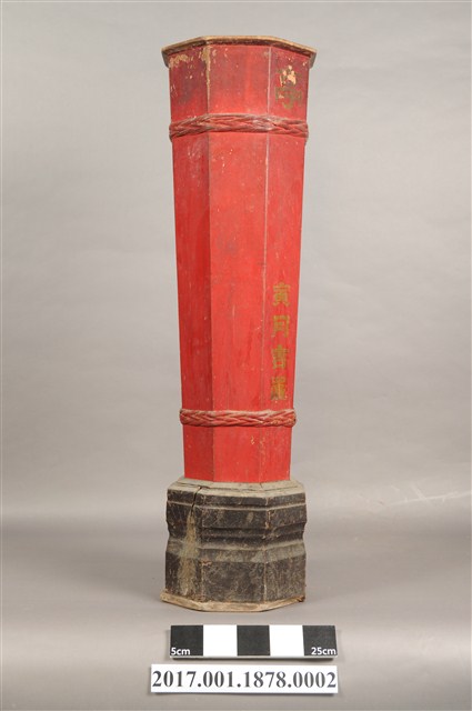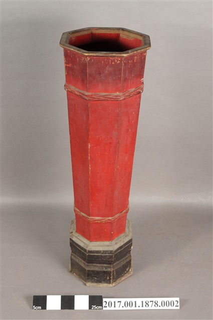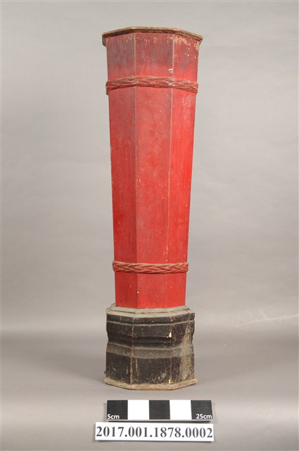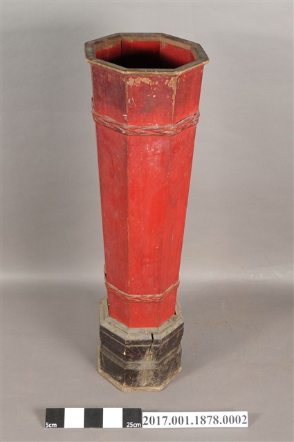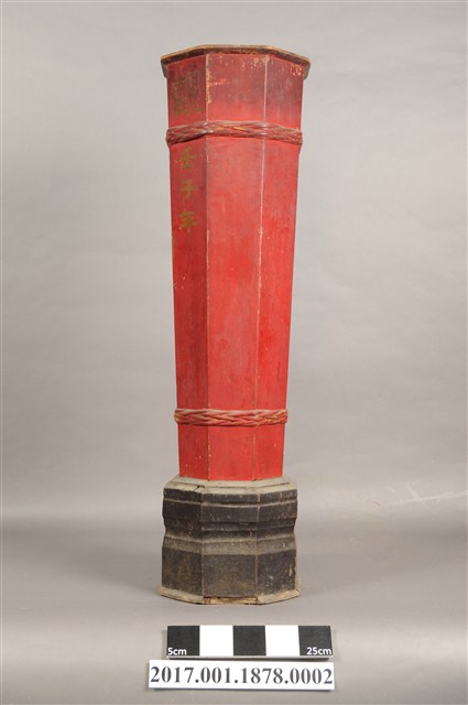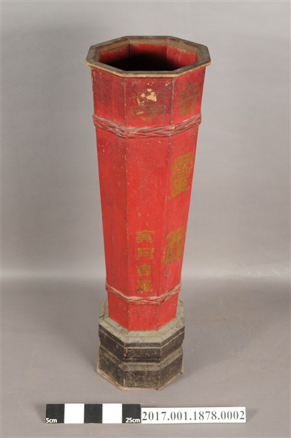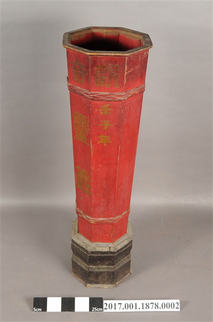 1.本件觀音亭籤筒為木製,平面呈現八角形,分為籤筒與臺座,籤筒固定在臺座上,籤筒的桶面漆紅漆、臺座漆黑漆,臺座局部受損。籤筒由八片上寬下窄的木片以嵌接的方式,在上、下方以竹篾編成的箍圈箍緊,桶面金字橫向書寫「大觀音亭」,縱向書寫「靈籤」、「壬子年」、「寅月吉置」。壬子年為西元1972年。