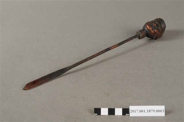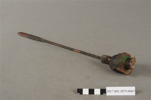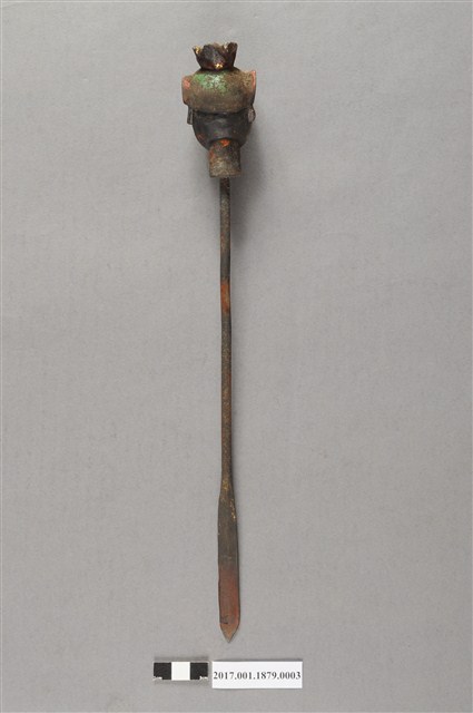 1.本件南營蕭聖者為五營頭之一,表面施作安金不見紅粧佛,墨線勾勒眉毛、眼珠,安金局部剝落。蕭聖者作武將造像,雙眼瞠目,皺眉,顴骨與頦肌凸出,頭戴兜鍪,頭頂佩戴小冠,偶頭在脖子以下插入鎗。