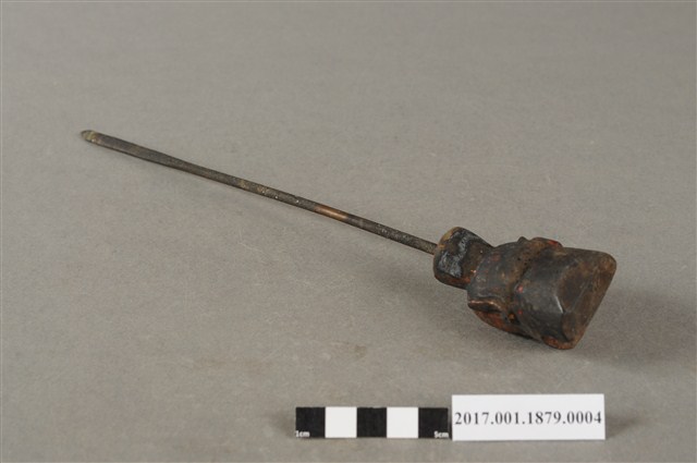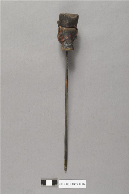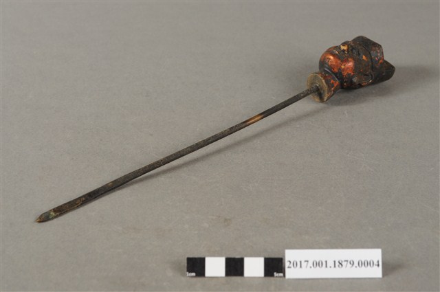 1.本件北營連聖者為五營頭之一,表面施作安金不見紅粧佛,墨線勾勒眉毛、眼珠,安金局部剝落。連聖者作武將造像,雙眼瞠目,皺眉,顴骨與頦肌凸出,頭戴硬殼幞頭,偶頭在脖子以下插入鎗。
