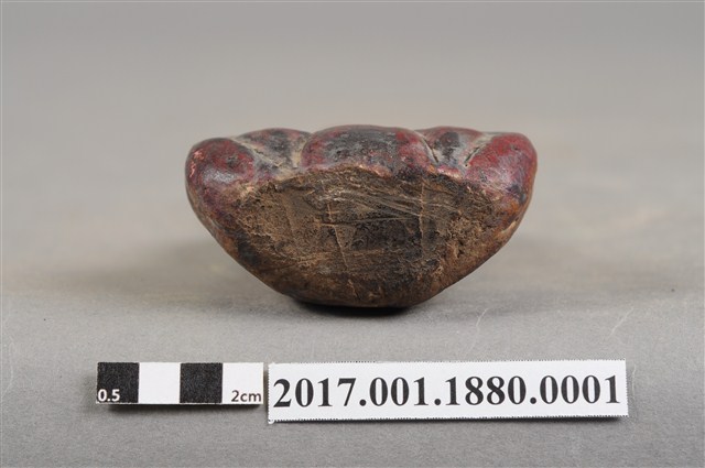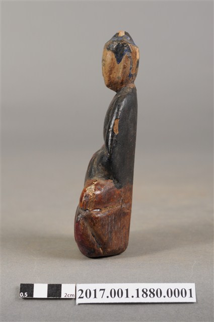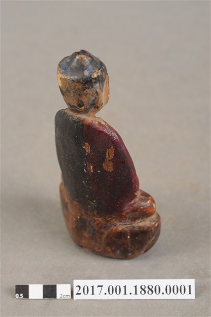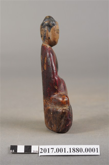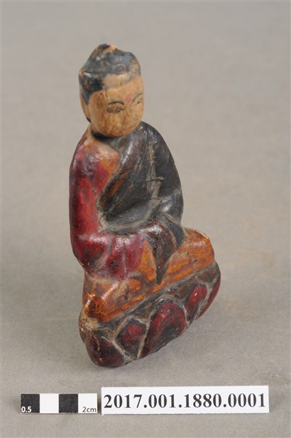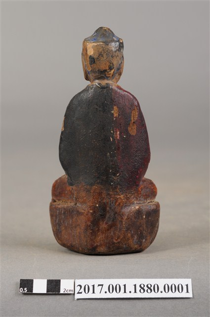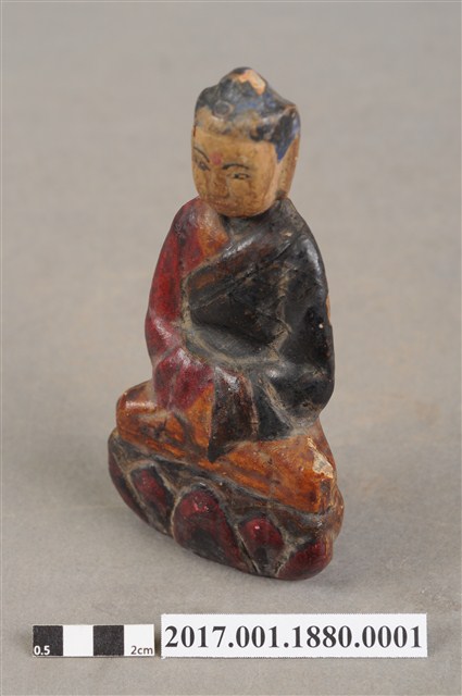 1.本件木雕佛像,為神牌的其中一件,表面施作塗裝。佛像作結跏趺坐姿態,眼睛與眉毛以墨筆繪製,長耳,頭部表現鏍髮。身著上紅下黃色海青,外搭黑色袈裟,雙手交握於腹前,手部隱於袖內。雙足盤腿,腳掌朝上,坐於仰蓮座之上。
