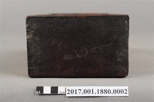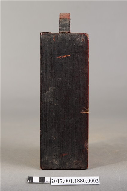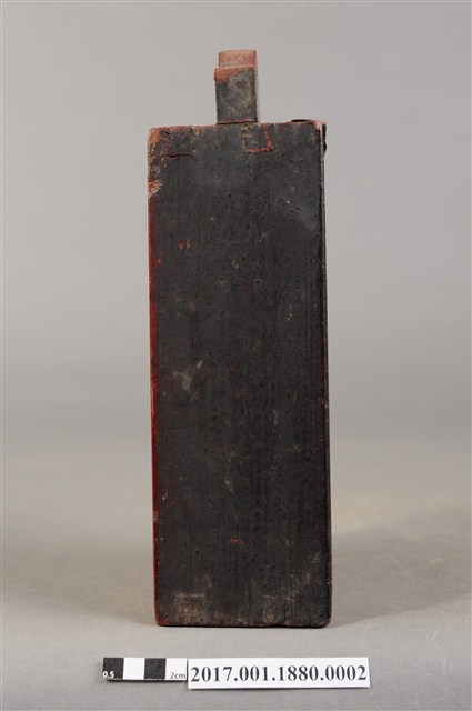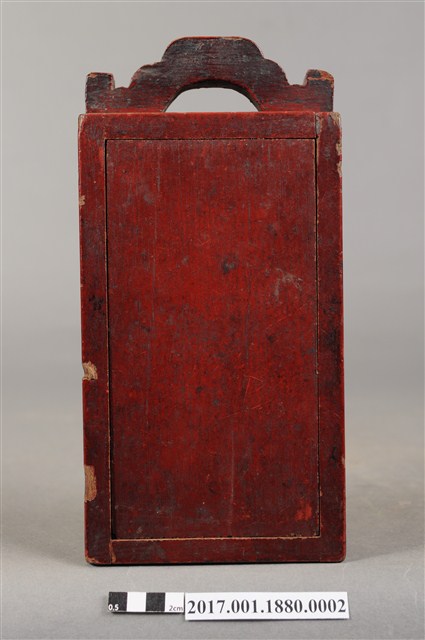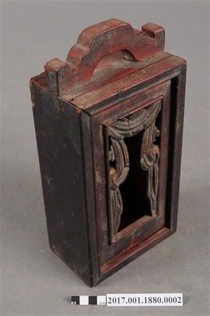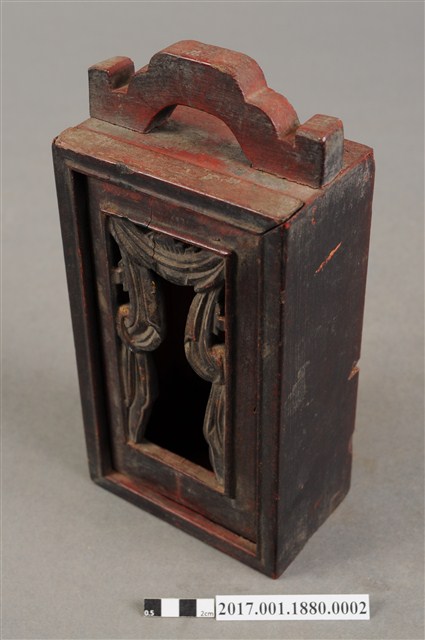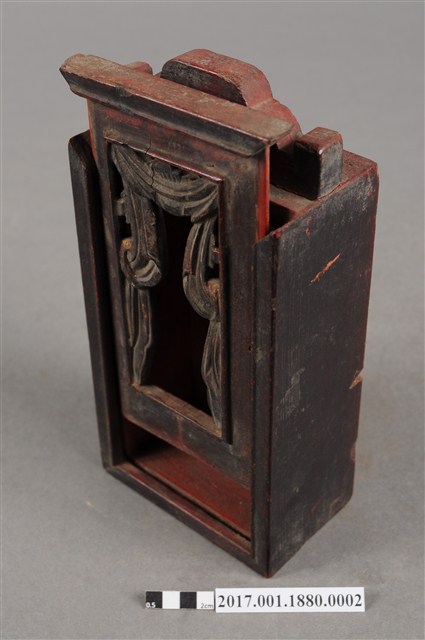 1.本件木製佛龕,為神牌的其中一件,由數片木片組裝而成,表面施作塗裝。佛龕正面作高、寬約二比一尺寸之長立方形,底面做正方形,前方作一面可由上方抽起之透雕格板,面板透雕帳縵紋樣,可露出內部之佛像。佛龕頂端有如意鈕提把,內部施作朱紅漆面。