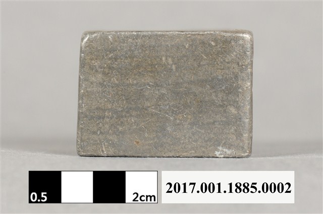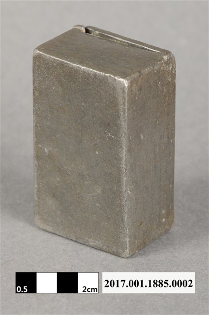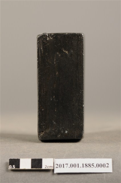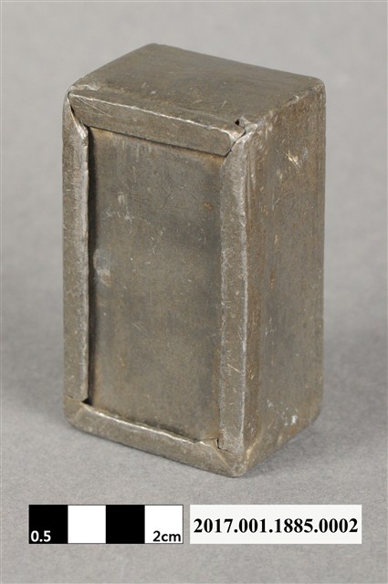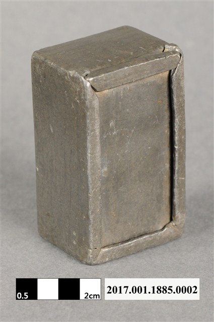 1.本件錫盒為神牌的其中一件,錫盒表面氧化。錫盒作長方形,正面邊框內有凹槽,正面邊框內留有凹槽,可插入抽板以利攜行。2.神牌由於上面刻有或印有神明的肖像,故民間一般稱為「神牌」,有的因為上面有保平安的符咒,而稱為「符牌」,上面除了刻有神明肖像外,抑或不刻神明肖像,改以文字表達某宮廟神明尊諱。神牌的形狀有各種式樣,有的會加鍊子,多數則繫紅棉線。(富俐崴文化事業有限公司/謝宗榮計畫主持)