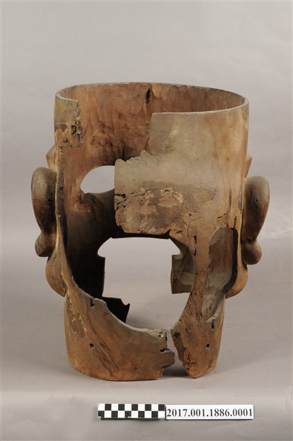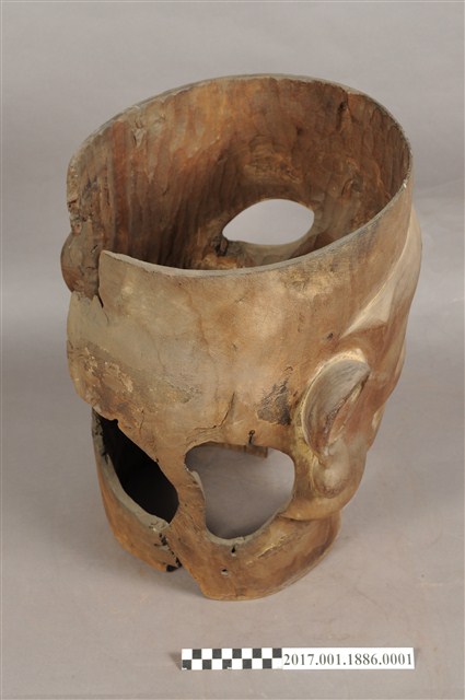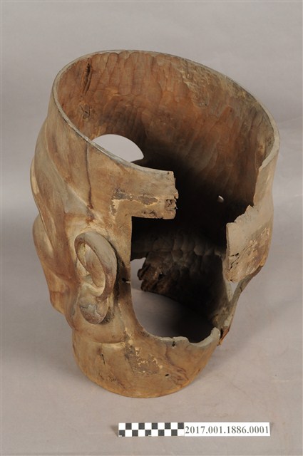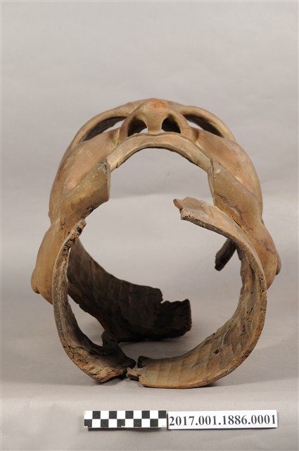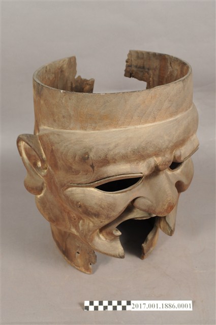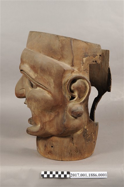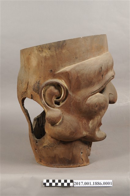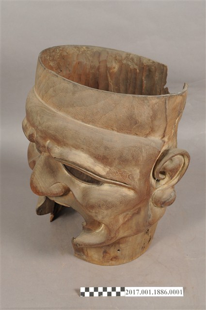 1.本件木雕神將偶頭,表面粧佛已除去,在偶頭背面尚存部分披麻的紗布,內部中空,後頸破損、下頷、後腦處損毀。眼睛採另外組裝方式製作,可以卸下。神將雙眼下垂,皺眉,眉毛作一道溝槽延伸至耳朵前,鸚勾鼻,顴骨突出,張開大口。上額內縮一圈,以利加戴帽冠。
