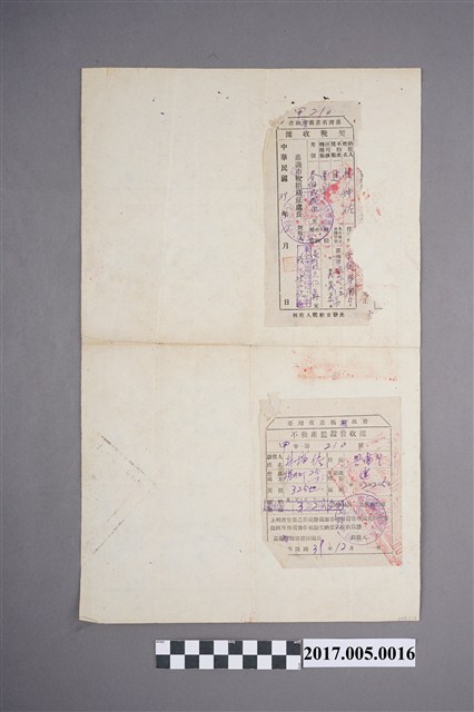 1.嘉義縣政府印發賣契本契嘉契字第354號,為林坤佐購買嘉南大圳水利委員會位於嘉義市土地,嘉義市稅捐稽征處核發之納稅證明,背面貼有契稅收據、不動產監證費收據。2.買主:林坤佐,賣主:臺灣省嘉南大圳水利委員會主任委員林蘭芽,立契日期:民國39年11月6日。 3.其他資訊如下。地類:建物敷地(按:建地)。坵段:25號之34(按:坵在臺語同「塊」、「畦」,為計算田地的單位)。座落:嘉義縣(市)堀川町,為水利組合宿舍大本營。面積:2釐2毫5絲。科則稅率:65則。契價:8角3分。應納契稅:19元5角。附註:評價325元。(曾祥宇、曾明德、莊竣雅撰寫)