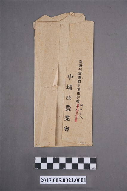 本件為林陳葱購買中埔庄農業會之「戰時特別定期預金」證書書袋,書袋上正面印有「決戰定期貯金證書袋、期限昭和 年 月 日」字樣,背面印有「臺南州嘉義郡中埔庄中埔四○ノ八、中埔庄農業會」等字。