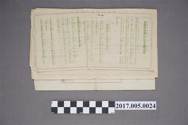 林陳葱投險日本生命保險株式會社之保險料領收證,自昭和14年投保起至昭和19年間,每年繳費,期間的領收證(繳費證明收據)裝訂成冊。