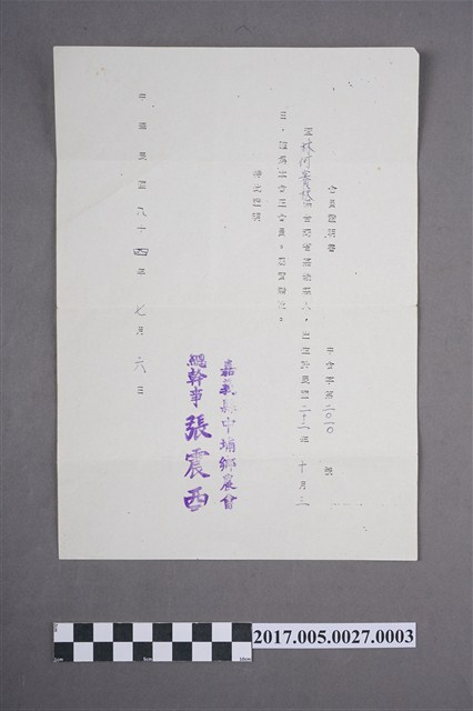 2017.005.0027.0003 林何賽秋中埔鄉農會會員證明書