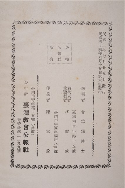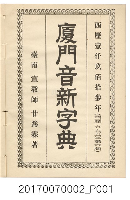 2. 本書為臺灣教會公報社1955 (民國44) 年發行第6版的臺語字典,編輯者為甘為霖博士,印刷者為臺南市陳木銓。本書最早為甘為霖牧師(Dr. William Campbell MD, 1841-1921)於1913年編著出版,原英文書名是 A Dictionary of Amoy Vernacular Spoken Throughout the Prefectures of Chin-chiu, Chiang-chiu and Formosa。字典發行後頗受歡迎,為第一本用羅馬拼音方式為台語標音,民間多以「甘字典」稱之,亦為臺語研究者書架上必備的參考書。