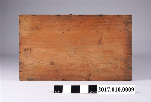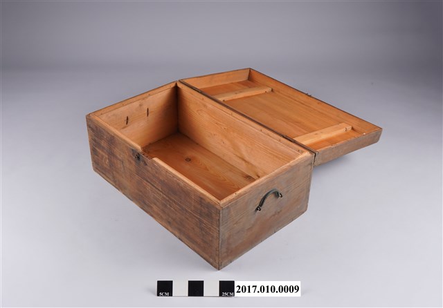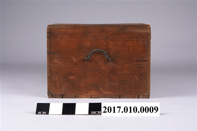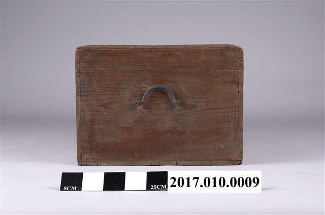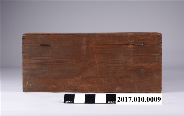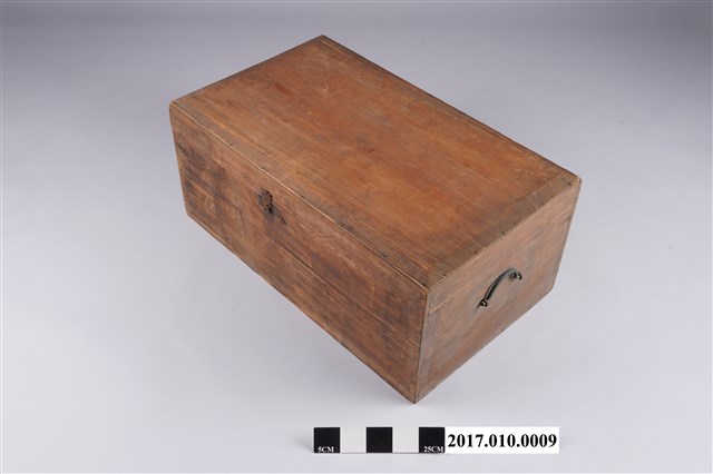 1.本件木製行李箱為黃瓊英女士於1946年來臺時所攜帶使用,主要作為置放衣物使用。 2.左右二側裝有把手鐵件,正面裝有鎖頭,惟鎖頭鐵件有鏽損情形。