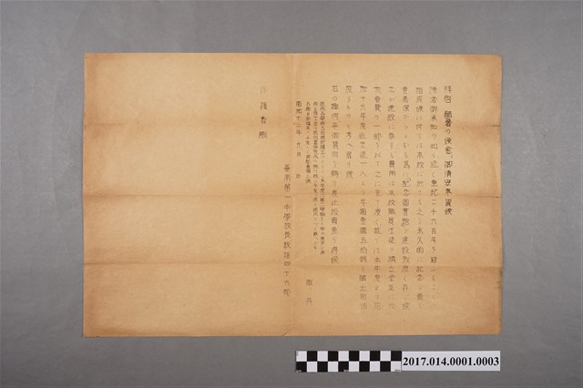 2017.014.0001.0003 臺南州立臺南第一中學校校長极垣四十六郎給學生監護人書信