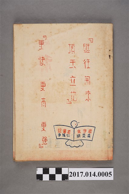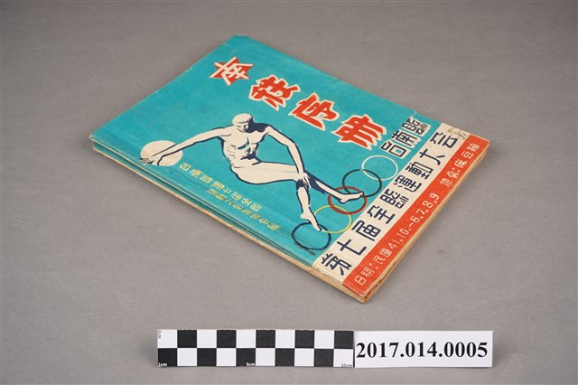 2. 臺南縣第7屆全縣運動大會秩序冊,藍色封面,中央有一擲鐵餅運動員圖案,右側有「南秩序冊」紅字,下方有:「臺南縣第七屆全縣運動大會」、「日期:民國41年10月6、7、8、9日,地點:麻豆鎮」等字樣。秩序冊由臺南縣第7屆全縣運動大會籌備會編輯,臺南市西門路高長印書局印製。封底為白色,印有「繼往開來, 頂天立地」、「更快、更高、更強」、「寫字者胡亦森」、「繪圖者李成仁」等字,右下角有施榮霖親筆簽名。