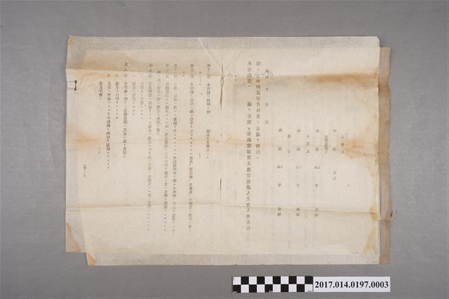 1. 本件為高雄州仁武區長孫龍水寄給施性垣之書信附件之一,標題為「土地小作契約書」,為昭和年間使用之水田租賃契約書範本,日文文字薄紙印刷。契約共有2張,第1張為1-7條款,第2張為第7-13條款與立約人、見證人等簽章處。