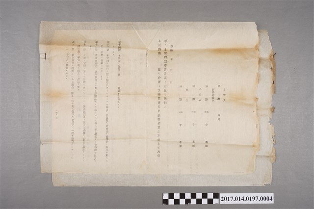 1. 本件為高雄州仁武區長孫龍水寄給施性垣之書信附件之二,標題為「土地小作契約書」,為昭和年間使用之畑田(旱田)租賃契約書範本,日文文字薄紙印刷。契約共有2張,第1張為1-9條款,第2張為第9-14條款與立約人、見證人等簽章處。