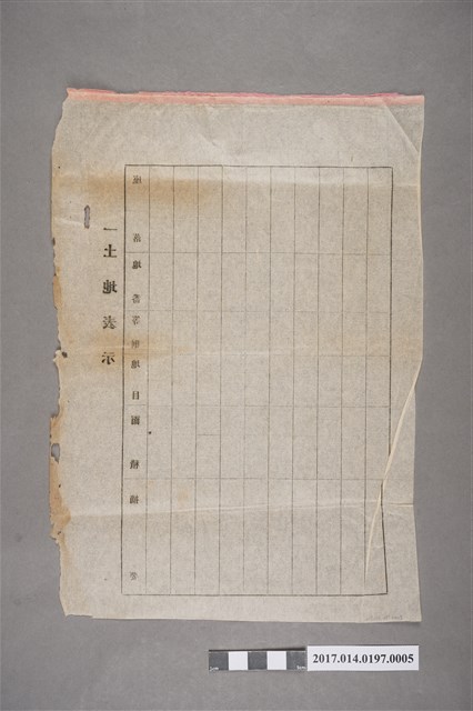 空白日文直式表格,為A5大小薄紙,表格標題為「土地標示」,有座落、地番(即地號)、等則(土地優劣等級)、地目、面積、摘要等6個欄位。本表格主要作為「土地小作契約書」(即土地租賃契約書)條約第一條所指稱之契約標的,屬契約書後附附件。