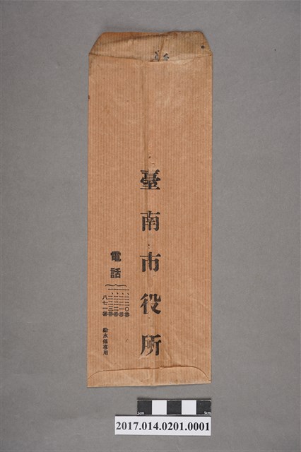 本件為1937昭和12年2月13日臺南市役所米穀統制組合致施蔡井書信之信封,日式直式信封,正面手書「永樂町三ノ五六 施蔡氏井 殿」。背面印有「臺南是役所 電話:一二二O号 一二二一号 一二二二号 一二二三号 八七一号 給水係專用」等字。