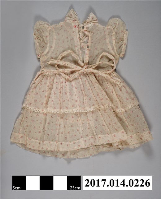 女童夏季連身洋裝,米色地粉紅色小碎花紡紗質地。圓形翻領,領口中央有一蝴蝶結加紅色塑膠鈕扣裝飾。後背面開口17公分,附金屬釘扣。圓蓬短袖,袖口束口,附金屬釘扣。洋裝帶有腰身及附後綁帶,綁帶長約60公分。衣長49公分,雙層A字型裙襬,裙襬寬48公分,邊緣有蕾絲滾邊,正面有2個蝴蝶結加紅色塑膠鈕扣裝飾。全件以手工加機器縫製。