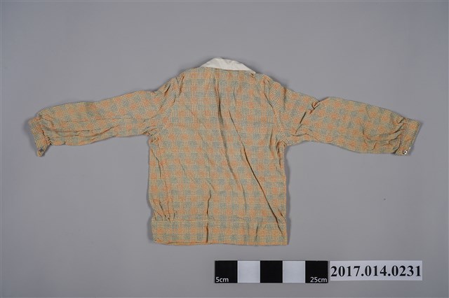 女童長袖襯衫,黃色地藍紅格紋棉布質地,白領翻領,胸前有30公分開口,金屬釘扣。筒狀直袖,袖口略窄反折收尾,附金屬釘扣。軀幹呈直筒狀,長度約及腰腹。機器加手工縫製女童春夏服飾。