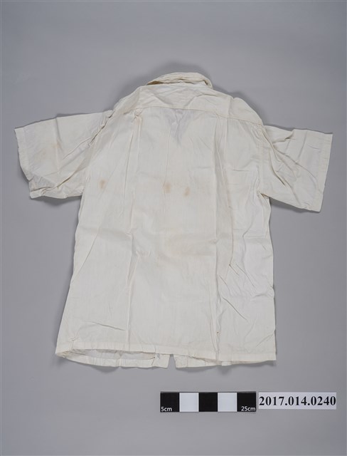 男子短袖白襯衫,棉質機縫成衣,翻領,寬袖,寬身,白色塑膠鈕扣,左右胸前各有一大口袋。領口內側縫有製造者藍色標籤「TRADE MARK 註冊商標 雪山牌 」字樣,左右襟內側衣角以黑筆書寫「黃家」、「施榮霖」字樣。推測本件為捐贈者父親施榮霖擔任臺南縣政府教育局公職時所穿著之夏季襯衫,黑筆字為送洗衣物時避免混淆的註記。