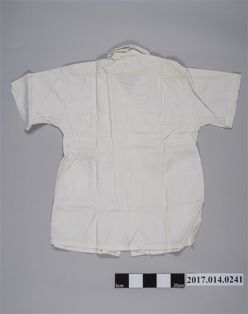 男子短袖白襯衫,棉質機縫成衣,翻領,寬袖,寬身,塑膠鈕扣,左右胸前各有一大口袋。領口內側縫有製造者藍色標籤「TRADE MARK 註冊商標 雪山牌」字樣,標籤右側以黑筆書寫「榮霖」二字,左右襟內側衣角亦以黑筆書寫「黃家」、「黃家」字樣。推測本件為捐贈者父親施榮霖擔任臺南縣政府教育局公職時所穿著之夏季襯衫,黑筆字為送洗衣物時避免混淆的註記。