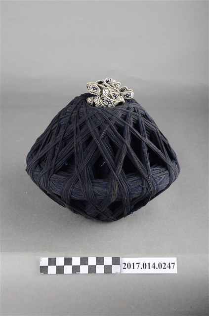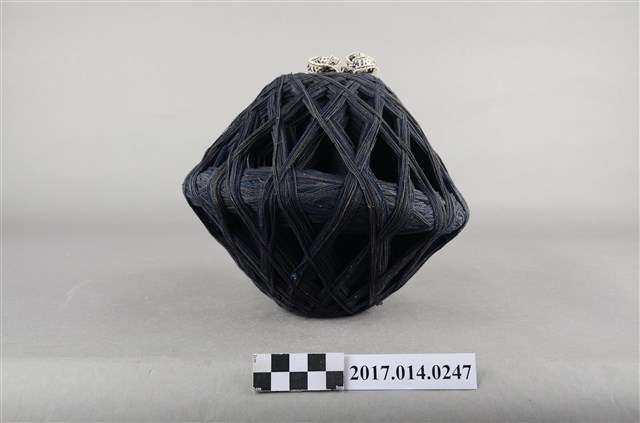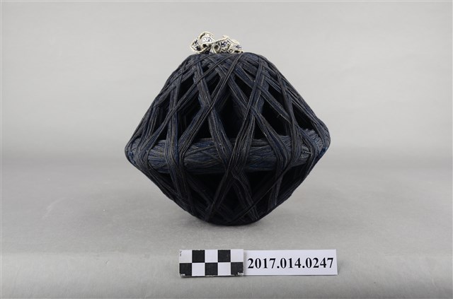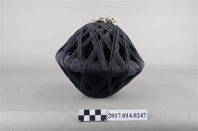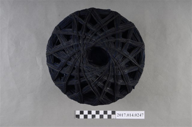 1. 本件為捐贈者於臺南市民權路3段老家衣櫃中發現之大型線球,推測為母親黃錦女士為自行縫製衣服所購買的材料。 2. 算珠型大型線球,長寬約20-25公分,藏青色粗棉線。