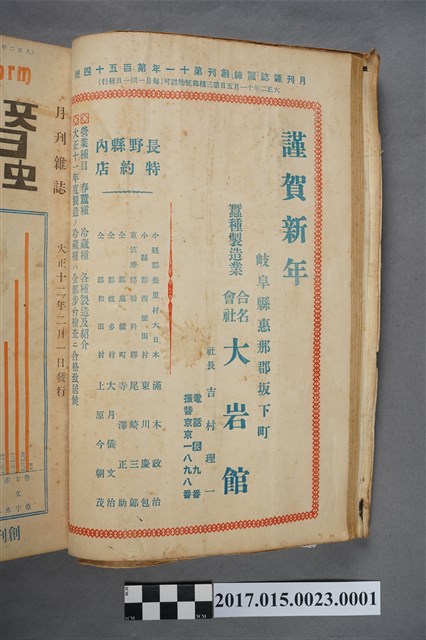 本物件為大正十二年發行的蠶絲月刊,目次頁不清楚,但從目次中的廣告可推測應為元月所出版的月刊。臺灣的蠶業在日本時代以前未見有系統的發展,日人根據調查發現臺灣的天然條件適合發展蠶業,並可提供日本之需求,因而開始以獎勵補助的方式推廣蠶業在臺發展,然結果並不如政府所預期,因此停止補助,但也意外促成臺灣蠶業以既有得基礎朝不同方向發展,1920年代後臺灣養蠶業由於製種業發達使展業方向由絲繭轉向種繭育。