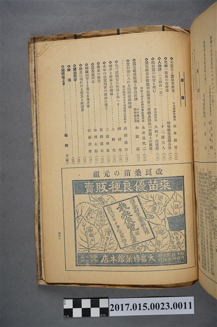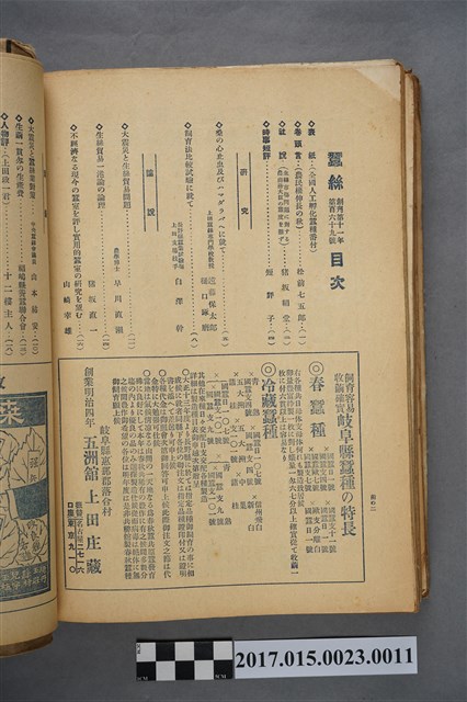 本物件為大正十二年十二月一日發行的蠶絲月刊,目次頁透過圖面無法辨識,廣告刊有歧阜縣五洲館上田莊藏與提供桑苗之相關從業者。臺灣的蠶業在日本時代以前未見有系統的發展,日人根據調查發現臺灣的天然條件適合發展蠶業,並可提供日本之需求,因而開始以獎勵補助的方式推廣蠶業在臺發展,然結果並不如政府所預期,因此停止補助,但也意外促成臺灣蠶業以既有得基礎朝不同方向發展,1920年代後臺灣養蠶業由於製種業發達使展業方向由絲繭轉向種繭育。