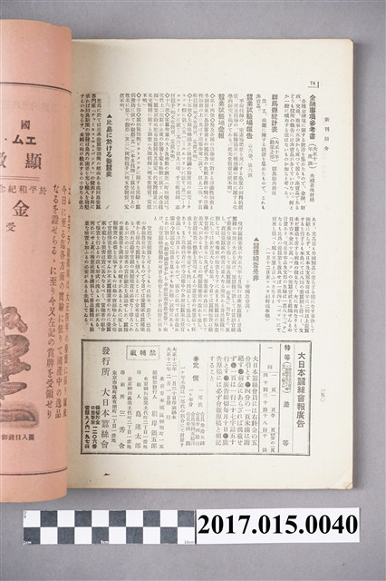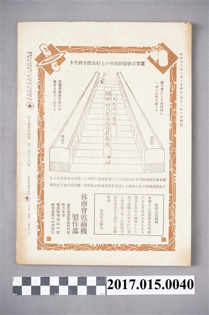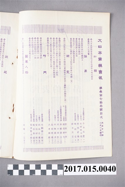 本件為大日本蠶絲會在1923年2月發行的第373號其內容主要為,大日本蠶絲會鹿兒島支會品評會光景、蠶絲業革新時機、蠶種問題及其政策、世界蠶業發展及日本中國蠶業考察、大正十一年蠶絲業總額 農商務省調查等內容。目錄摘要:大正十一年十二月中橫濱、紐育、上海、里昂、懬東各市況=紐育生絲在荷 大日本蠶絲會記事 (六八)●第三回高等蠶絲會講習會=支會役員の囑託=特別會員の推舉=有功委の授與=本會職員の出張 (六九)●蠶絲?技術官會議=橫濱取引所の現物數引調查委員會=蠶絲取引員設置=生絲書入稅の撮廢決議=橫濱蠶絲貿易間