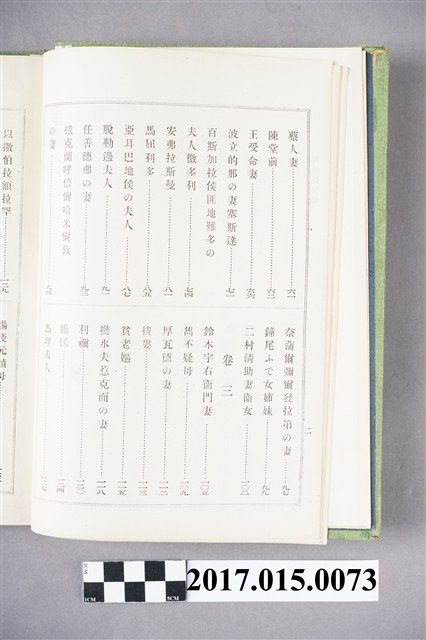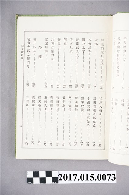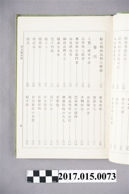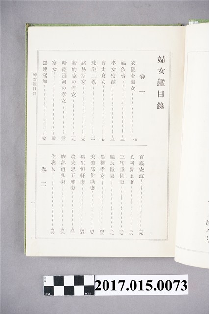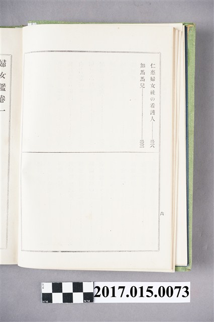 此婦女鑑由宮內省三等出仕文學西村茂樹擔任編纂,合資會社吉川弘文館代表吉川半七發行,於明治三十九年五月十五日宮內省三版發行典藏,內容收集囊括國內外婦女傳奇,以表揚並推崇婦女之德與輔佐家庭之重任,總計六卷內容重心從孝行、慈愛、持家等共120餘則婦女故事,包括陶侃之母、齊桓衛姬、楊烈婦等,除了故事內文以日文呈現外,並附有精美黑白插畫,皆採用西洋畫具與畫法配合刀刻黑墨印刷精美呈現。