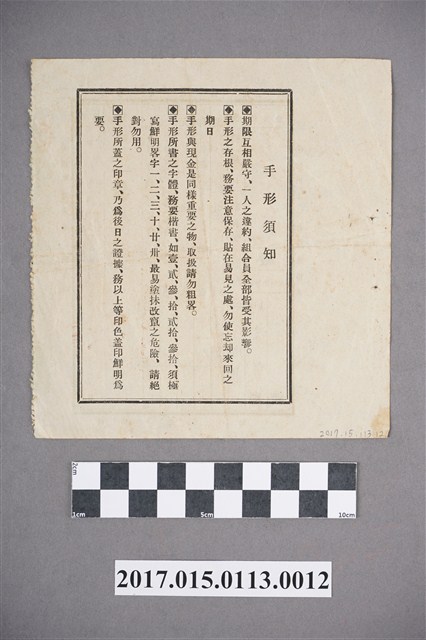 信用乃成功之夥伴也 番號第六九號 振出月日 中華民國 參拾六年一月十三日 貸付額 一金 壹仟元 借用主 李文祥 殿 連帶借用人 胡文賢
