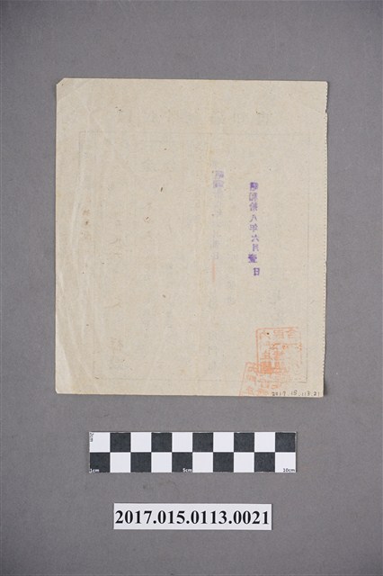 此份文物為國民貯金通知書,貯蓄者為內門莊李文祥,而本期國民貯金為一金參四元,昭和十八年六月三十日限,內門信用組合的貯蓄相成度候也,內門莊國民貯蓄組合長德丸增美。1937年7月,中日全面戰爭爆發後,台灣戰略地位益形重要,為使台人亦具有日本國民之愛國心和犧牲精神,台灣亦有「皇民化運動」之提倡,企圖使台人徹底同化成為「皇國民」。隨著戰事的持續和擴大,日本為了因應長期戰爭及確立國防經濟體制之需要,於1938年發布「國家總動員法」,以謀求更廣泛地統制運用人、物資源,達成軍事目的。台灣亦在該法籠罩下進入「戰時體制」。