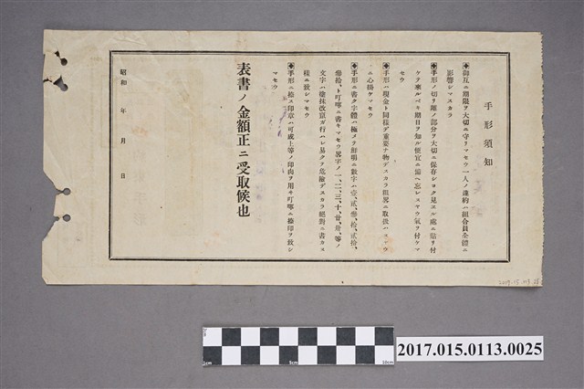 此份文物為約束手形(本票)呈現長方紙狀,上面由右而左著寫第六九號,還印有中華民國印花稅票,一金壹仟元,支拂期日由原本的昭和劃掉,改寫為中華民國參六年四月拾貳日,支拂地高雄州旗山郡內門莊,支拂場所則將原本的內門信用販賣購買利用組合劃掉,改印上內門莊農業會,連最後的保證責任也是改為內門莊農業會,可見此時為剛光復之時台灣企業、協會名稱開始轉變。日文中的約束手形,中文為承兌票據(本票)的意思,為在預定的日子中承諾支付本票上所寫一定數額的金錢。內門鄉農會創立於民國十一年十二月八日,最初稱為「內門莊信用組合」,推舉內