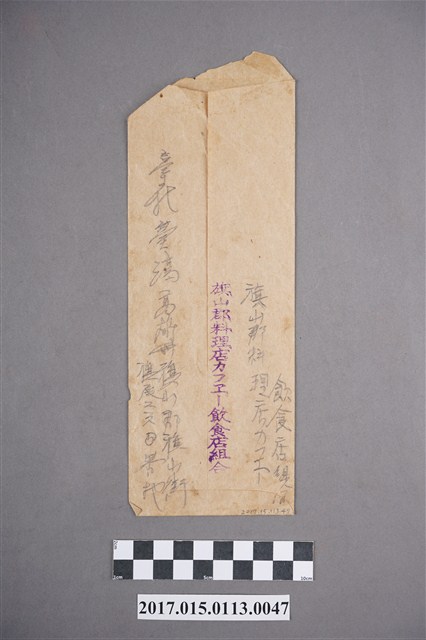 本件為信封一件,應為旗山郡料理店咖啡飲食店組合寄送給內門內埔144號的李文祥先生,背面寫有??????旗山郡雅山街旗尾264番地,內容物不詳。